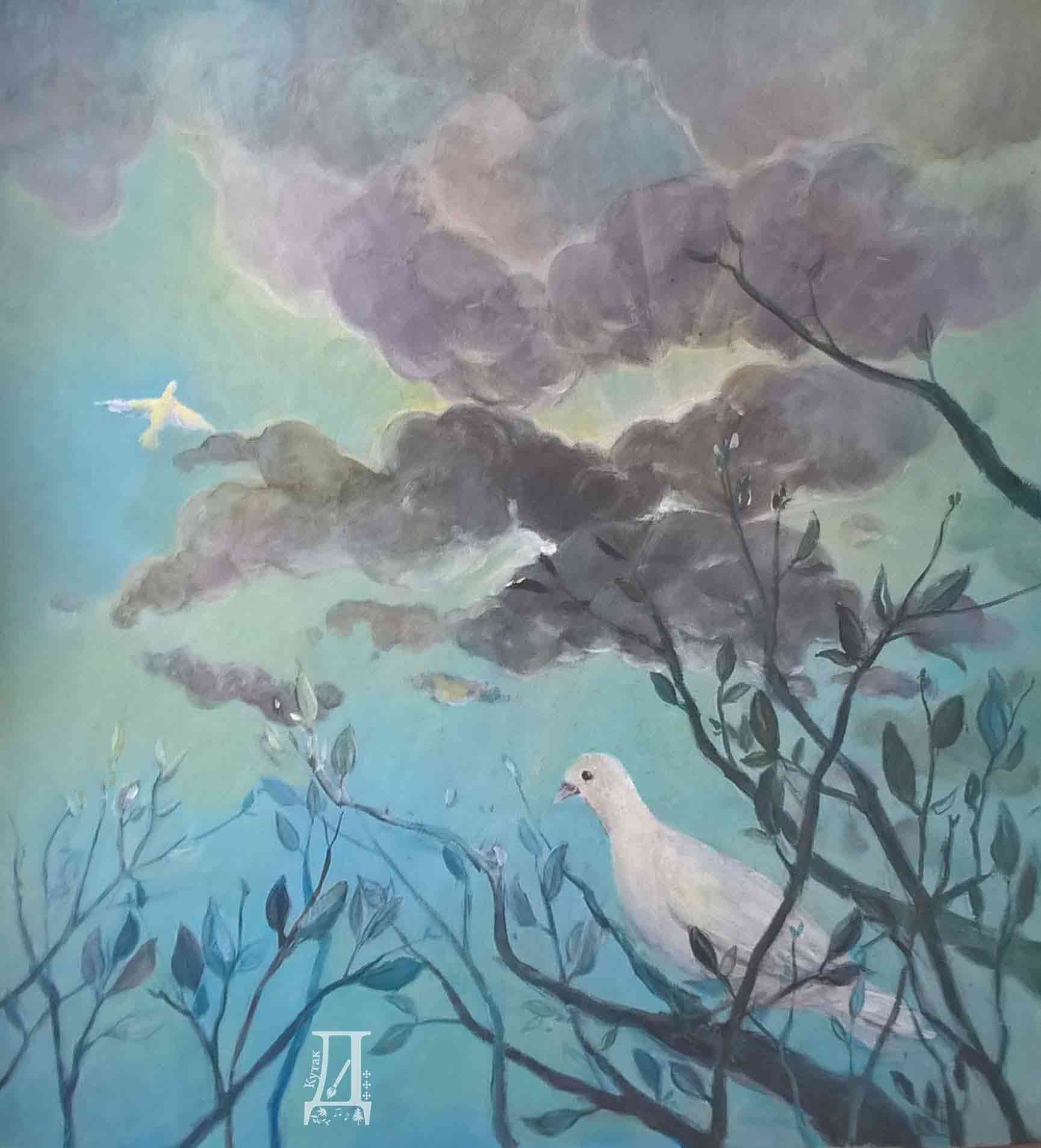 Уље на картону: Голубица у крошњи дрвета.