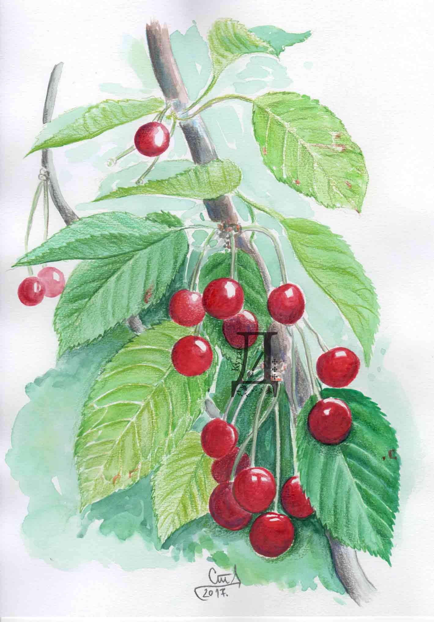 Лековита биљка трешња, акварел.
